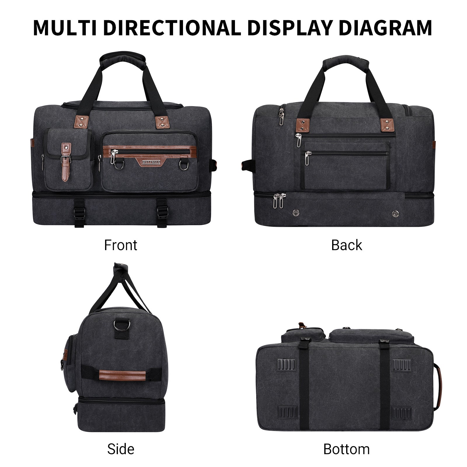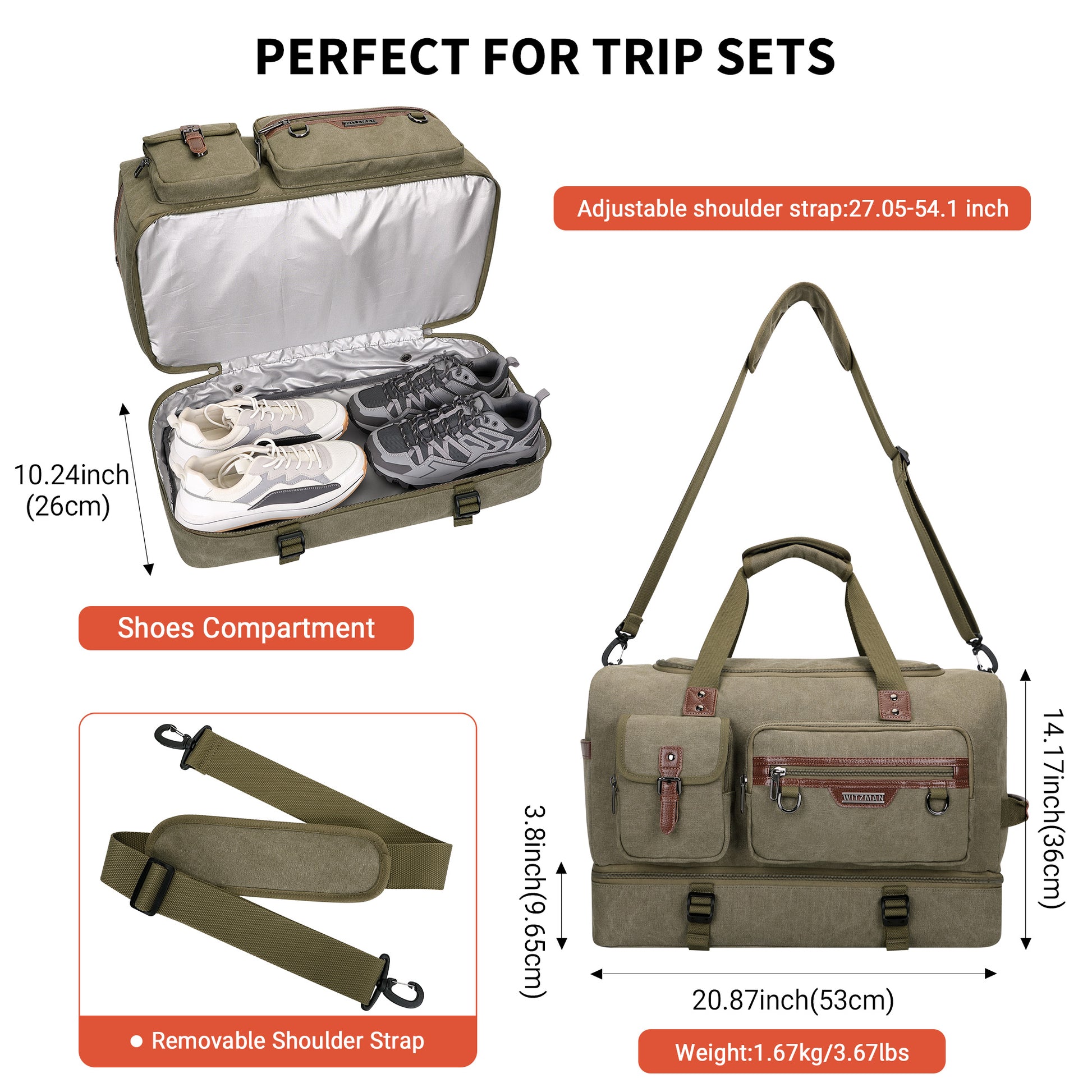 - Material and Dimensions: The travel bag is made from high-quality canvas fabric,Grey polyester lining, soft pressure relief foam hand, practical metal zipper.Dimensions:20.87"L x 10.24"W x 14.17" H(53 x 26x 36cm),Net weight: 1.67kg(3.67lbs).This product is not suitable for children under 12 years old.