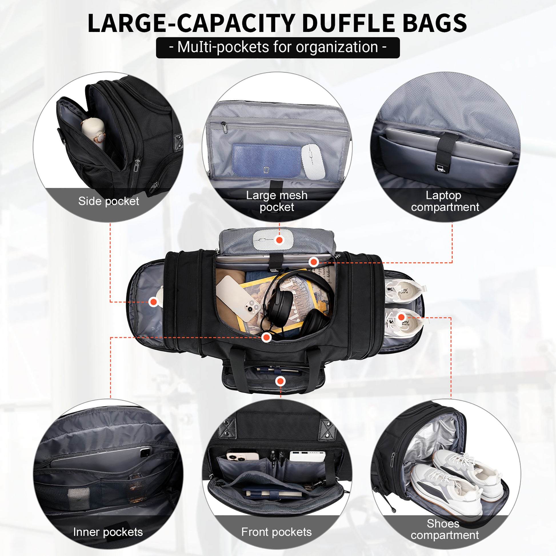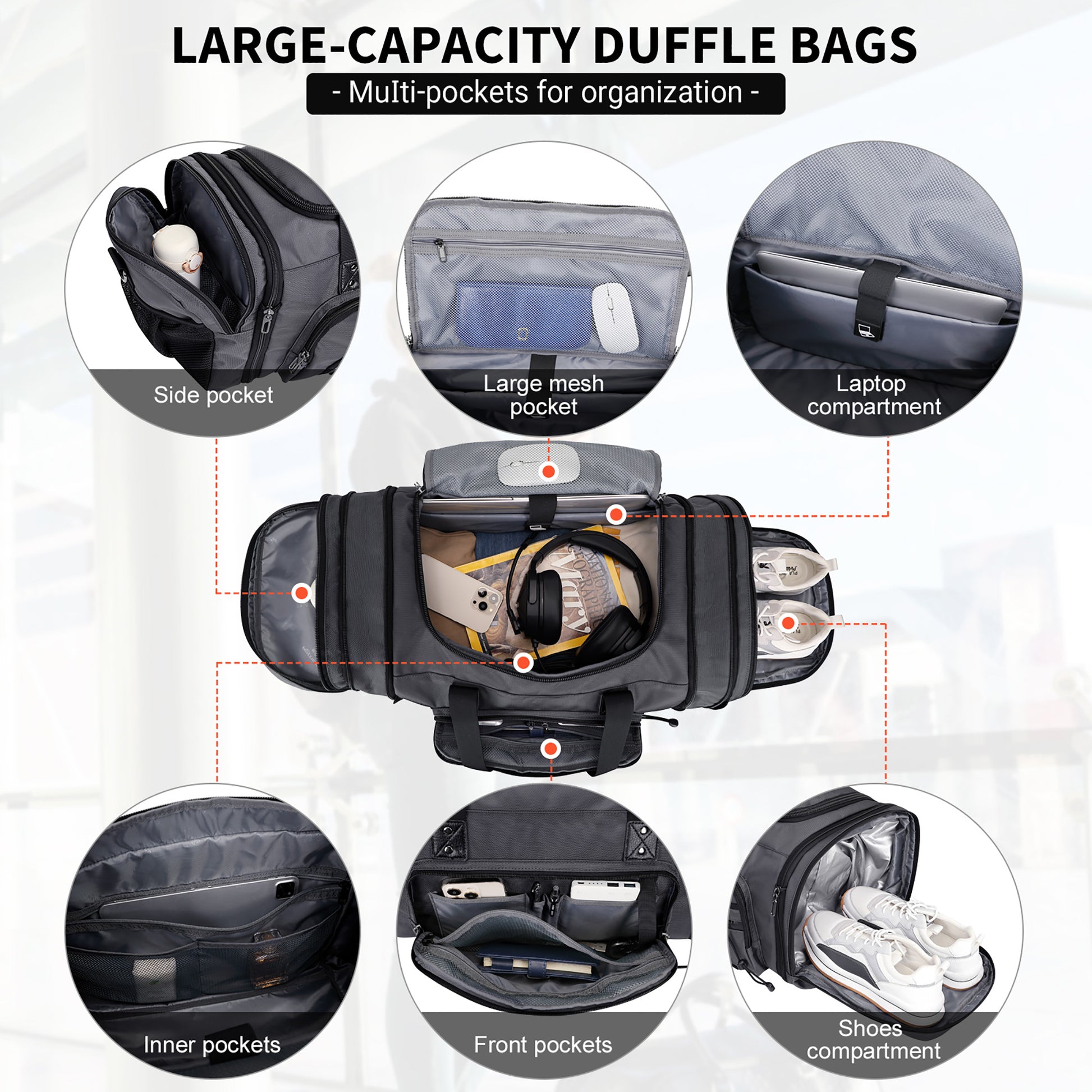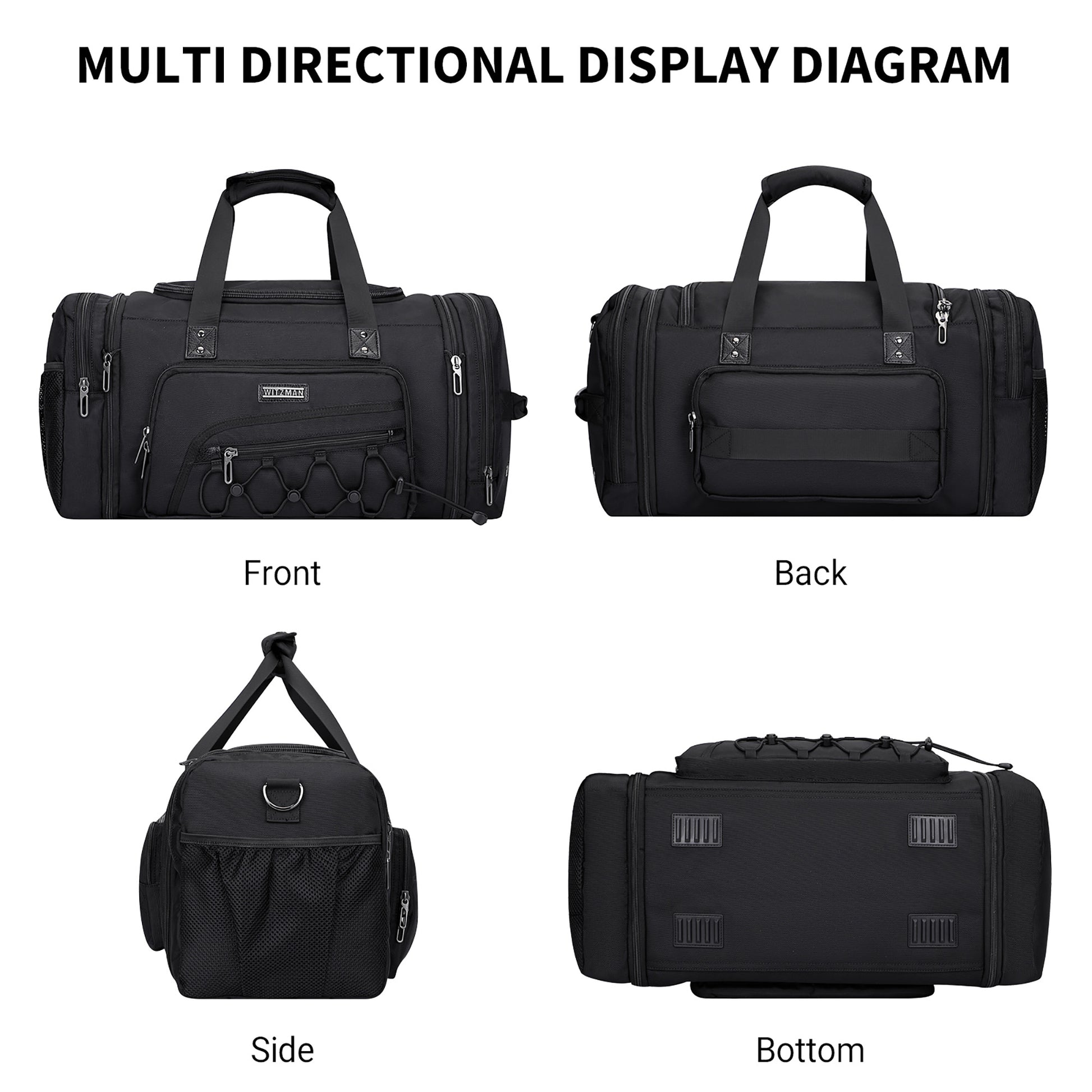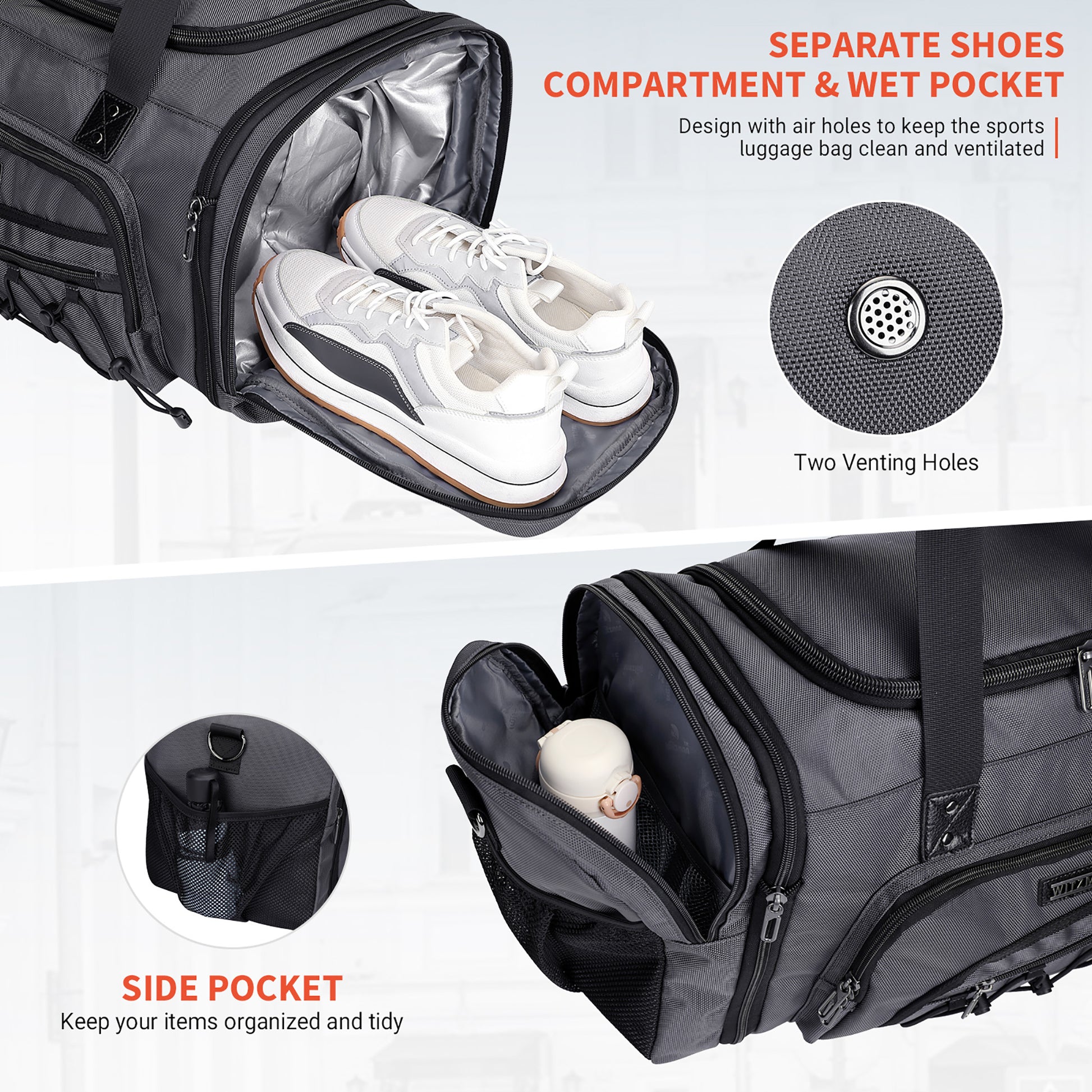 - Large Capacity:These duffle bags can be essential items for a 3 to 4 day journey. Can hold clothes, shoes, toiletries, and so. External: There are 2 zipper pockets, 2 open pockets, and 3 pen insertion pockets; There is a wet-dry separation layer and luggage webbing on the back. Internal: 5 mesh pockets, 2 zipper pockets, and an independent shoe compartment. Suitable as a weekend bag, overnight bag, and short-distance travel bag, sport gym duffle bag.