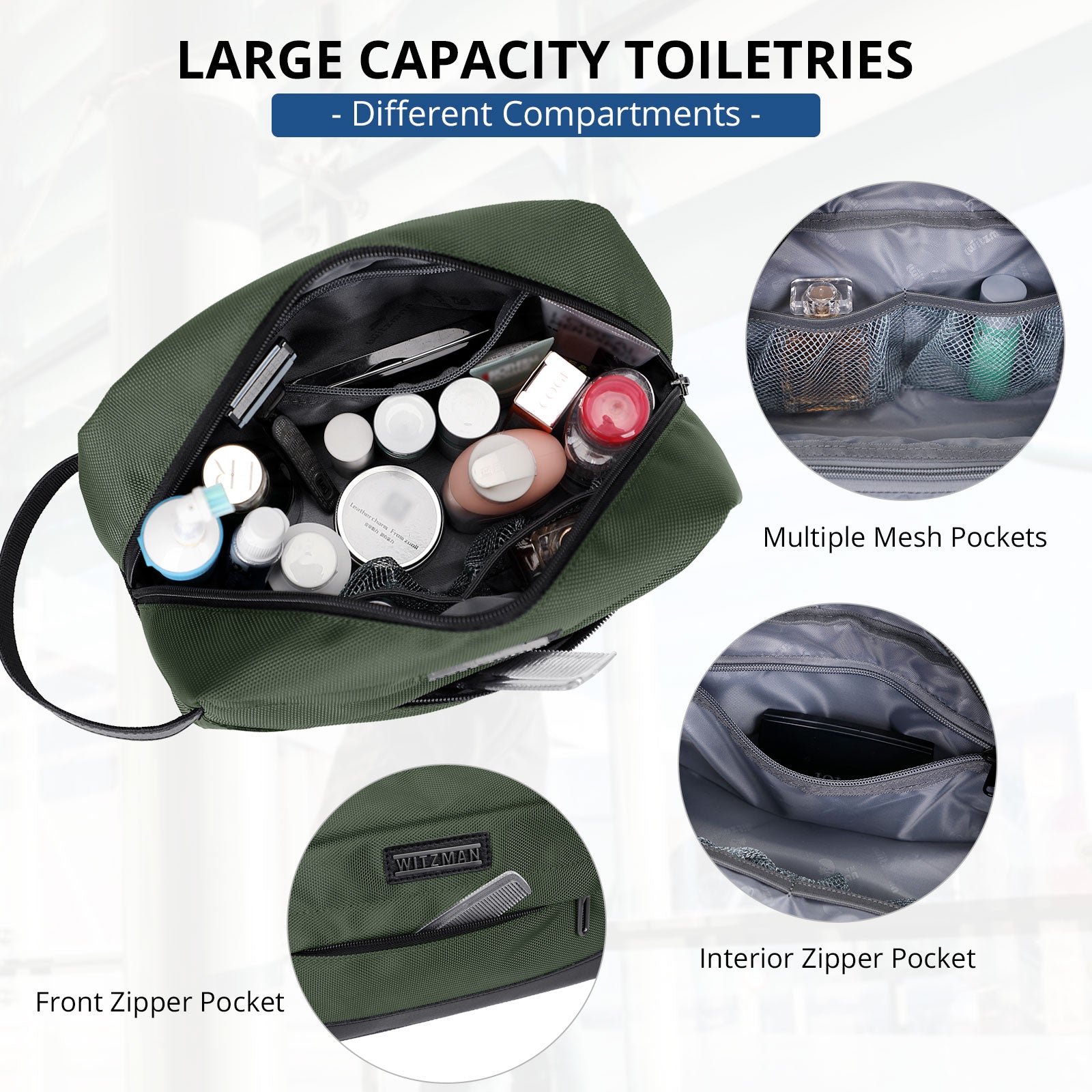 - Humanized Design: The two compartments of the men's toiletries bag are designed with zippers, each of which has been rigorously tested to be smooth at the same time more sturdy. The main compartment has a zippered pocket,two open mesh bags, increasing the usability of the toiletries bag, the side handle design can be hung on the towel rack, bathroom, and any other place where you need to display toiletries, convenient for you to take it.