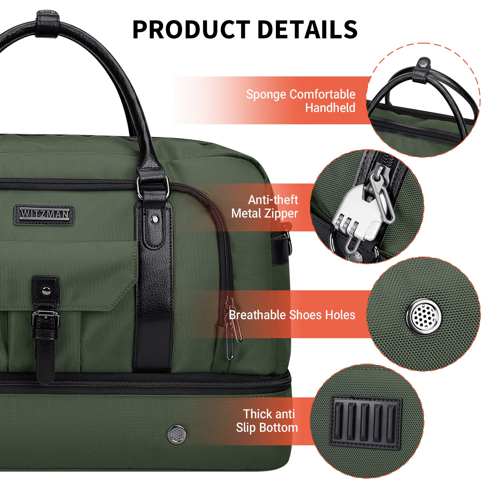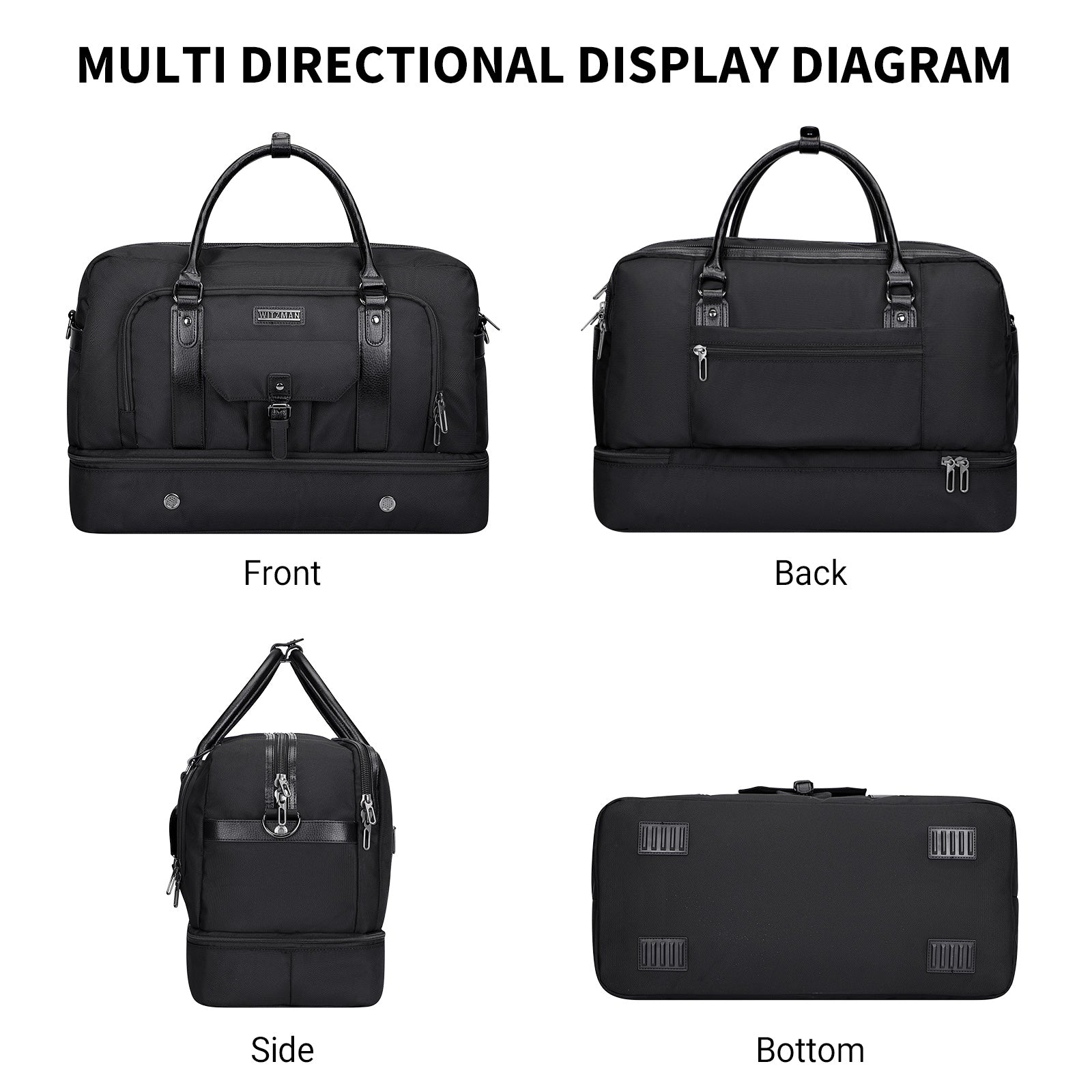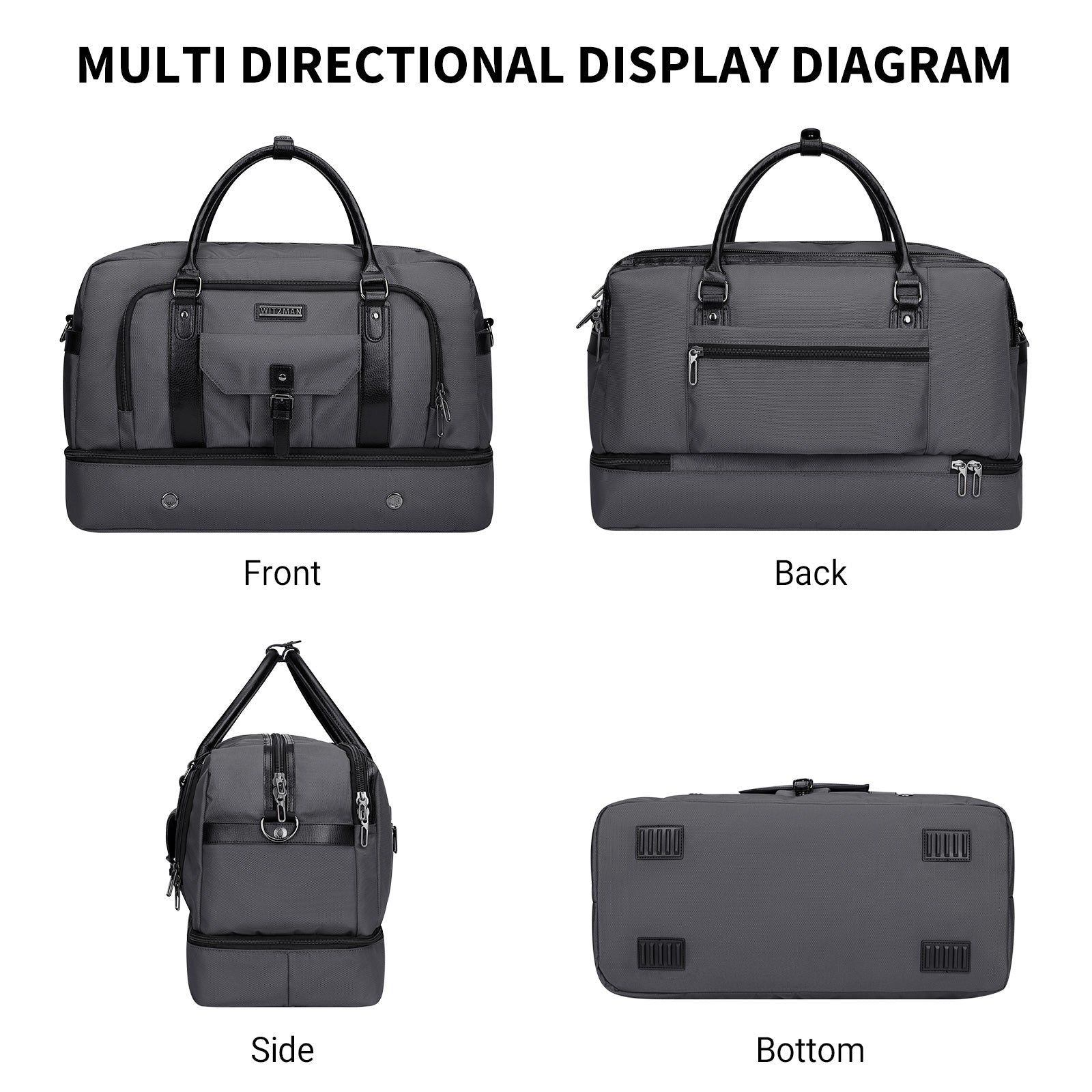- Separate Shoes Compartment:This weekender bag bottom has a independent shoe cabin, which can accommodate 3 pairs of men shoes or dirty clothes and the air vents to disperse the bad smell. It can help you avoid dirtying other clothes when packing, also provide more convenience for your travel.