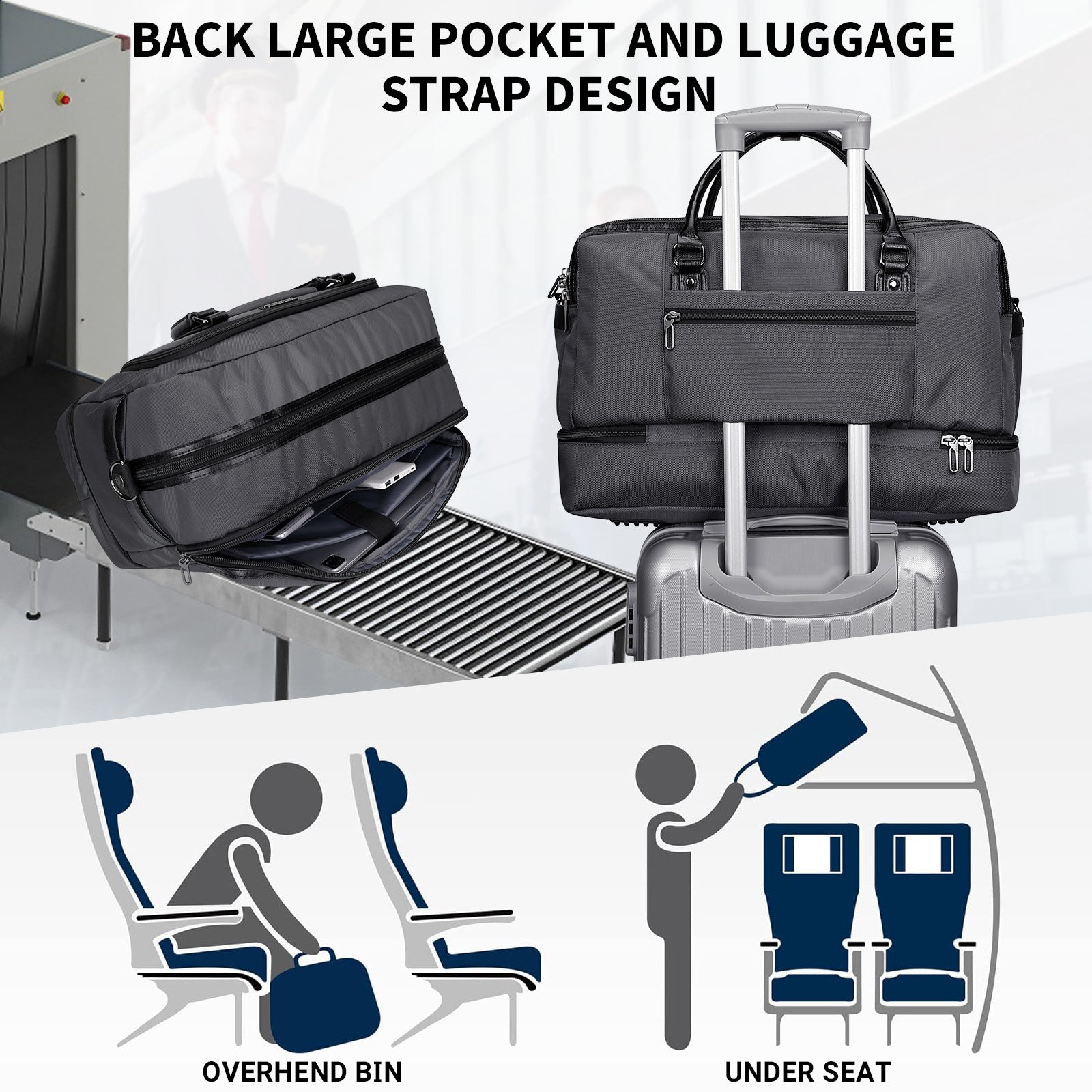 - Airplane Carry On Bag: The carry-on compliant bag for personal item for airline travel, can be placed in the overhead cabin of the aircraft. Use it as a duffle bag, travel bag, weekender bag, overnight bag, carry on bag. It also be served as a sports gym bag.