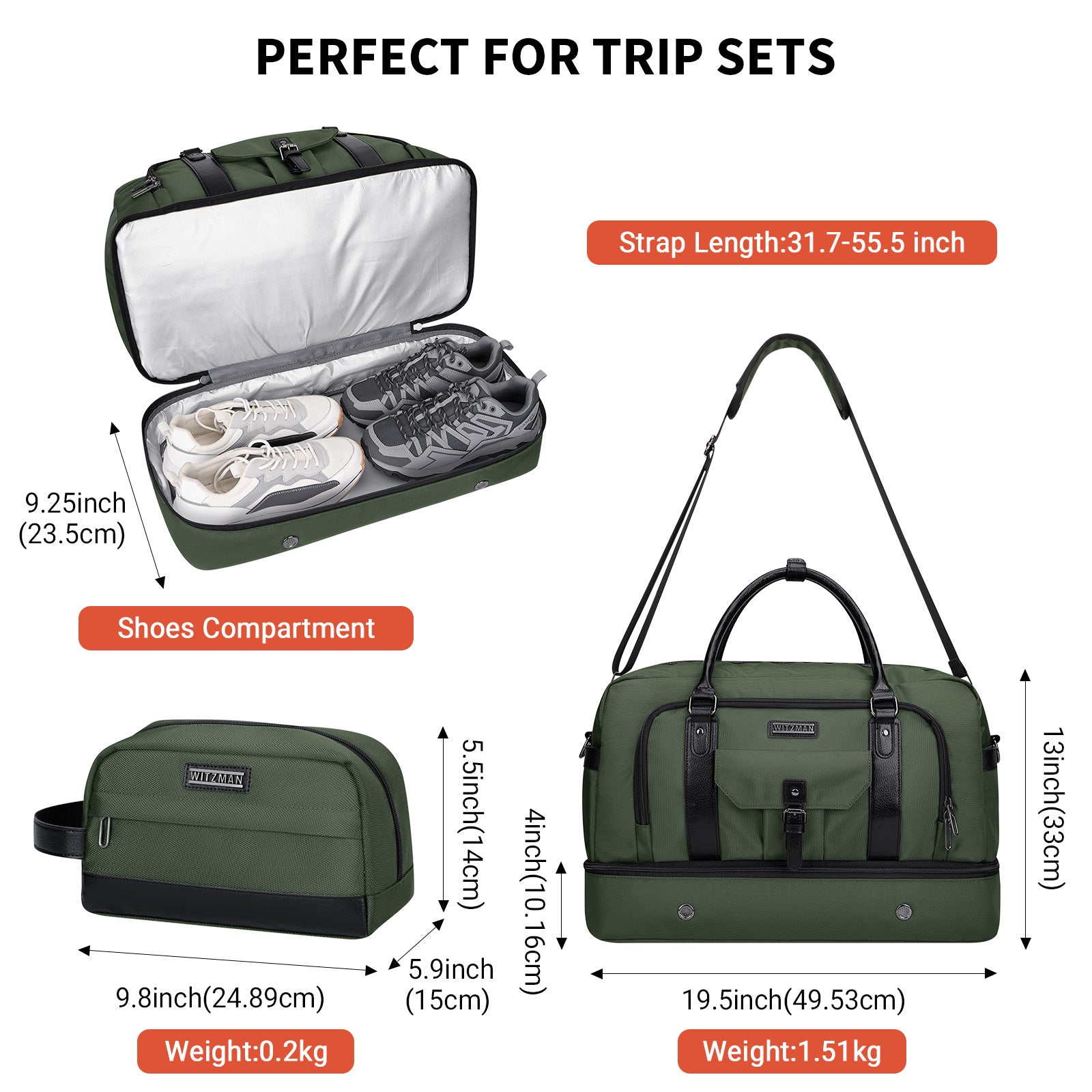 WITZMAN Weekender Bags for Men Women Carry On Duffle Overnight Bag with Toiletry Bag Sets Travel Duffel Bag Shoes Compartment(B694)